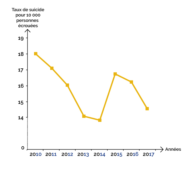 Le taux de mortalité par suicide en détention, calculé à partir de la population moyenne écrouée hébergée, a baissé de 4 points (de 18,4 à 14,3%oo) de 2009 à 2017, et de 3 points entre 2016 et 2017 (passant de 17,3 en 2016 à 14,3%oo en 2017).