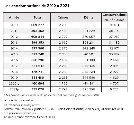 La durée moyenne est alors de 24 mois pour les crimes, de 5,5 mois pour les délits. Les infractionsPlus de la moitié des crimes sanctionnés sont des viols.